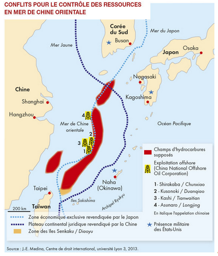 Découvrir la géopolitique chinoise en mer de Chine (source:atlas 2017 Courrier International, France info)